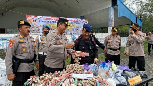 TEGAL – Polres Tegal Kota Polda Jawa Tengah melakukan pemusnahan Barang Bukti (BB) serbuk bahan dan ribuan petasan siap edar, Jumat (31/3/2023).